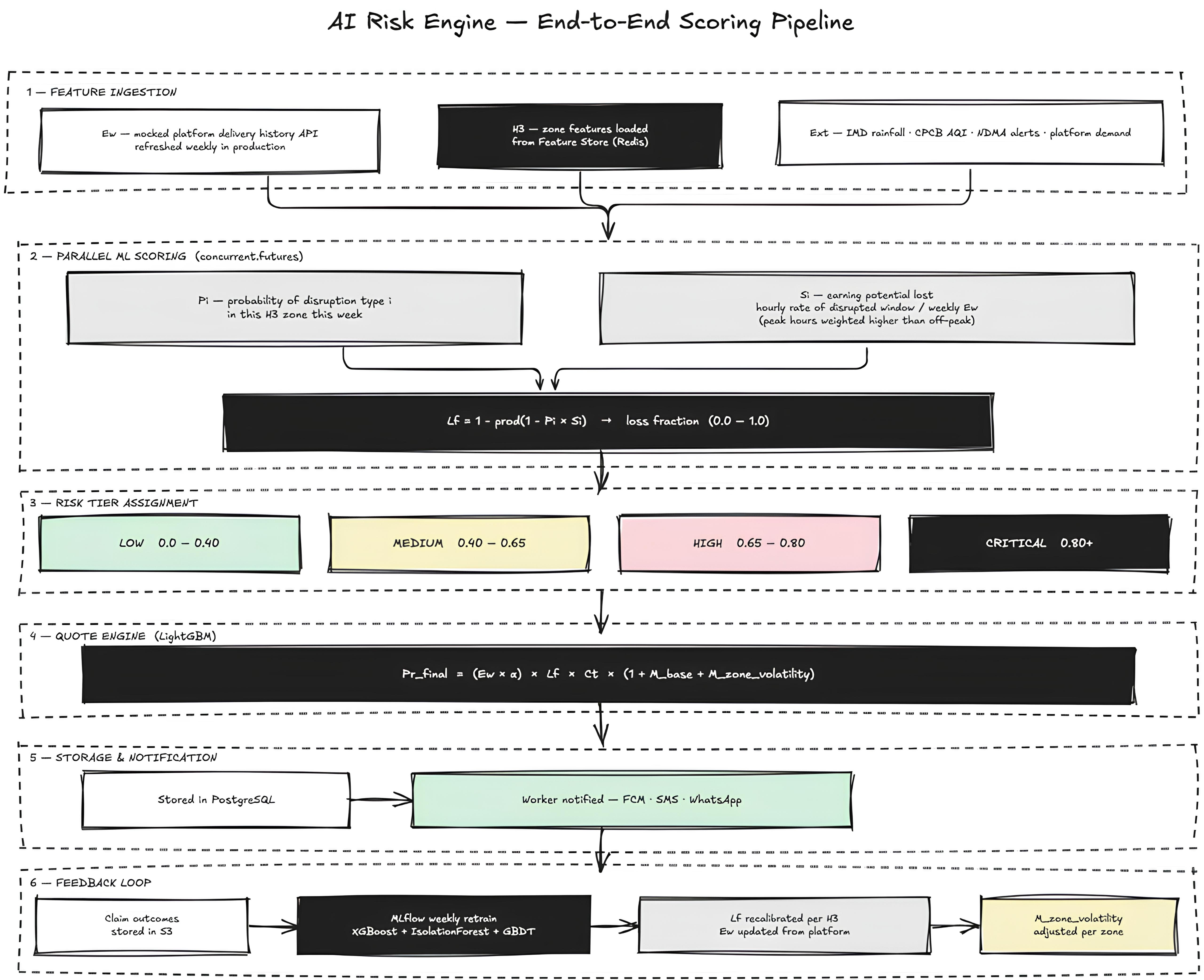 Model types are already listed above: XGBoost (risk/Lf), LightGBM (pricing), forecasting (near-term risk), and fraud gating (IsolationForest + GBDT).