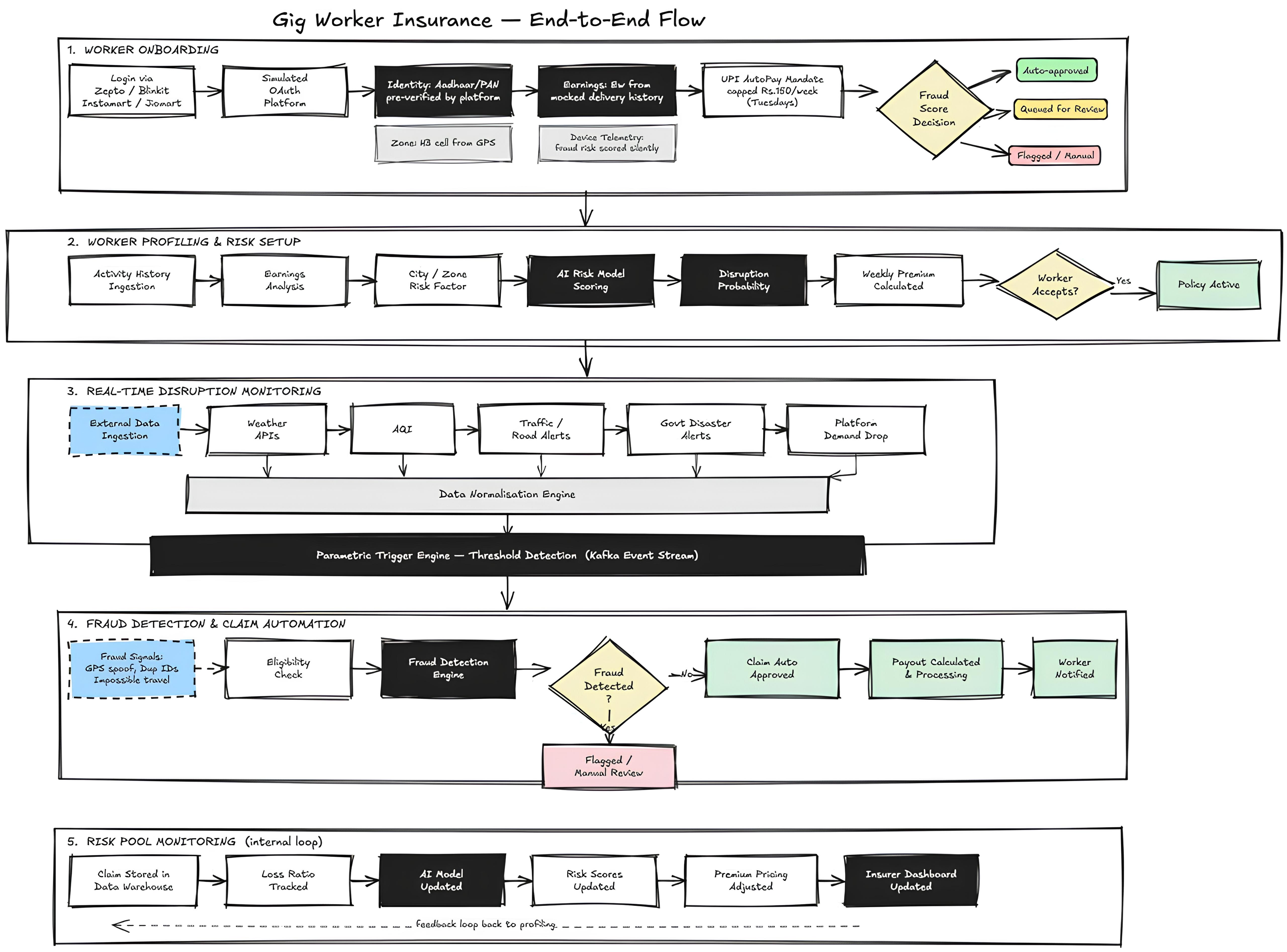 DisruptionEventis emitted - Claim engine verifies eligibility; fraud engine gates auto-approval
