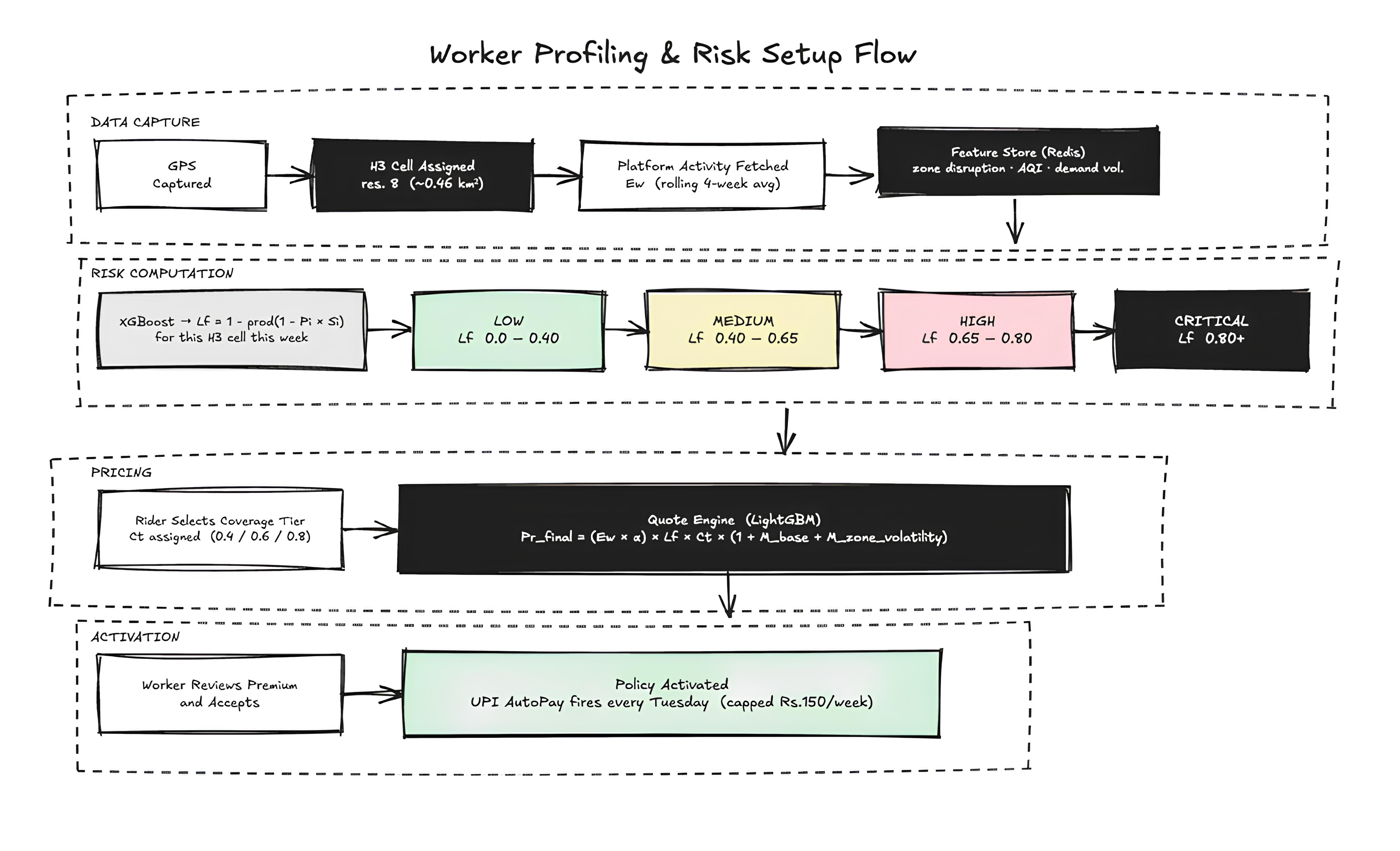 Ew: rolling 4-week average earnings baselinealpha: affordable risk fraction (microinsurance benchmark), default0.015Lf: composite loss fraction for the rider's H3 zone and current weekCt: coverage tier factor (Basic/Standard/Premium)M: sustainability margin for risk pool stability