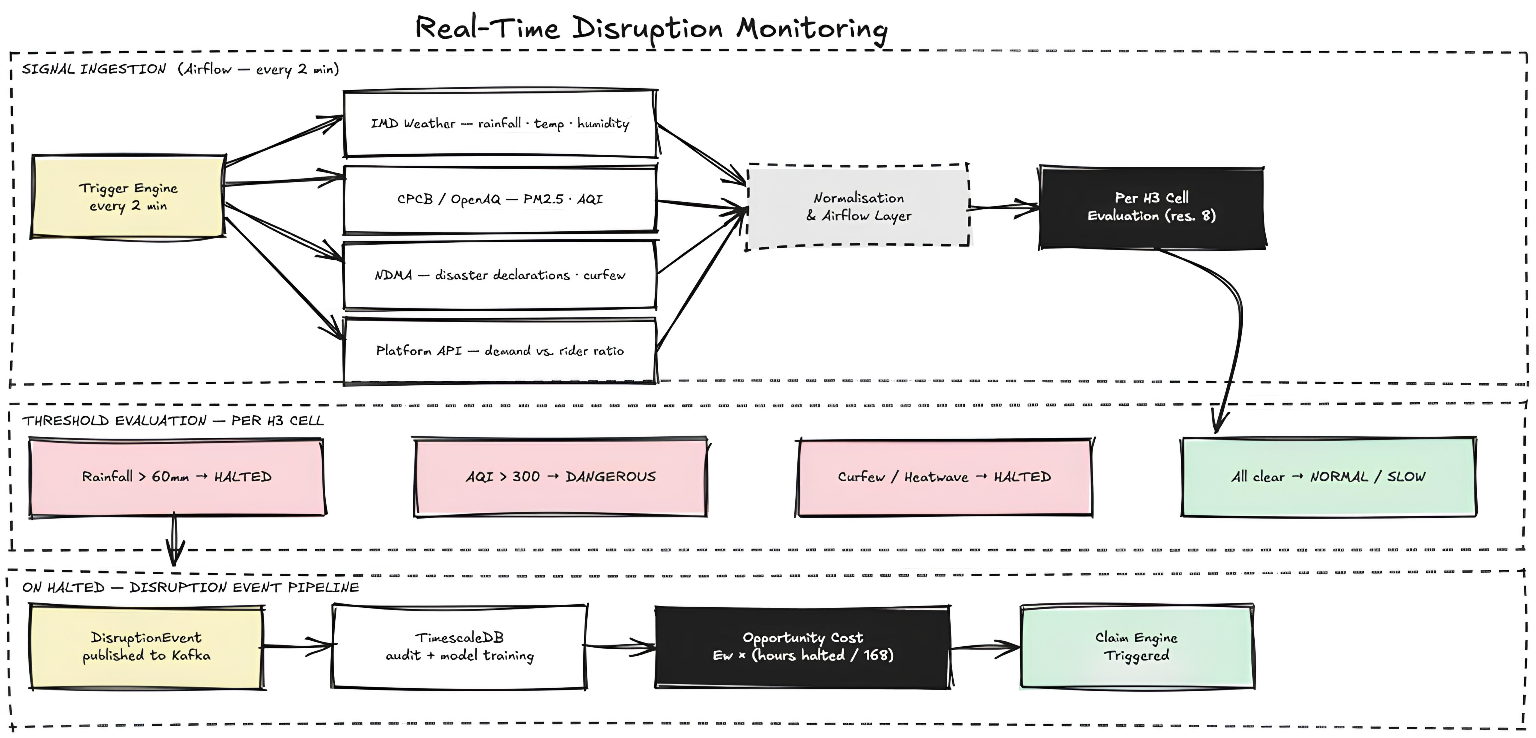 Raw signals -> normalization -> zone/time event schema -> time-series persistence -> online features -> trigger engine + AI scoring.
